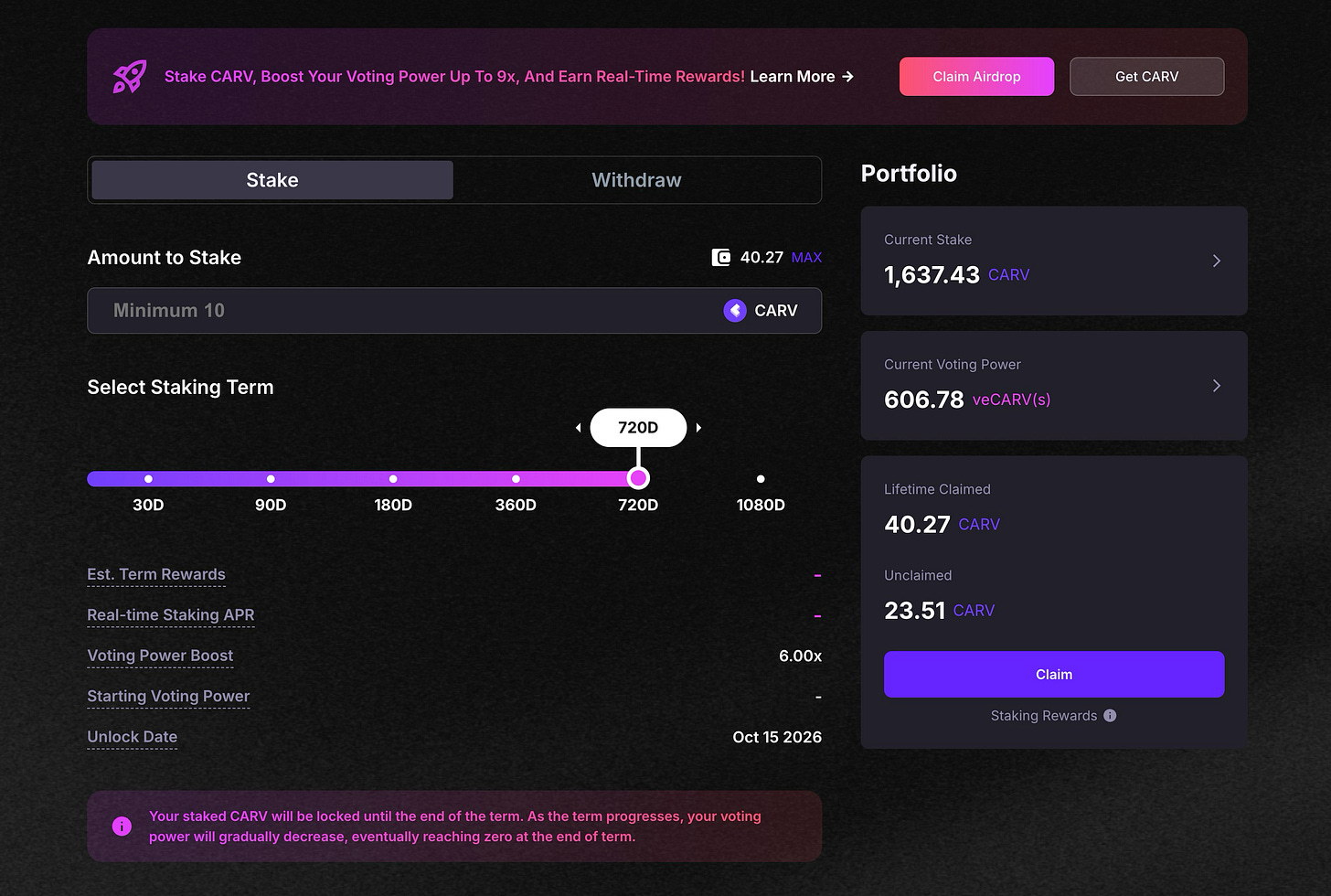 In addition to introducing $CARV, we're rolling out the $CARV staking mechanism. By opting to stake for longer periods, you can earn a higher APR and gain veCARV as voting power, giving you a say in shaping CARV's future.