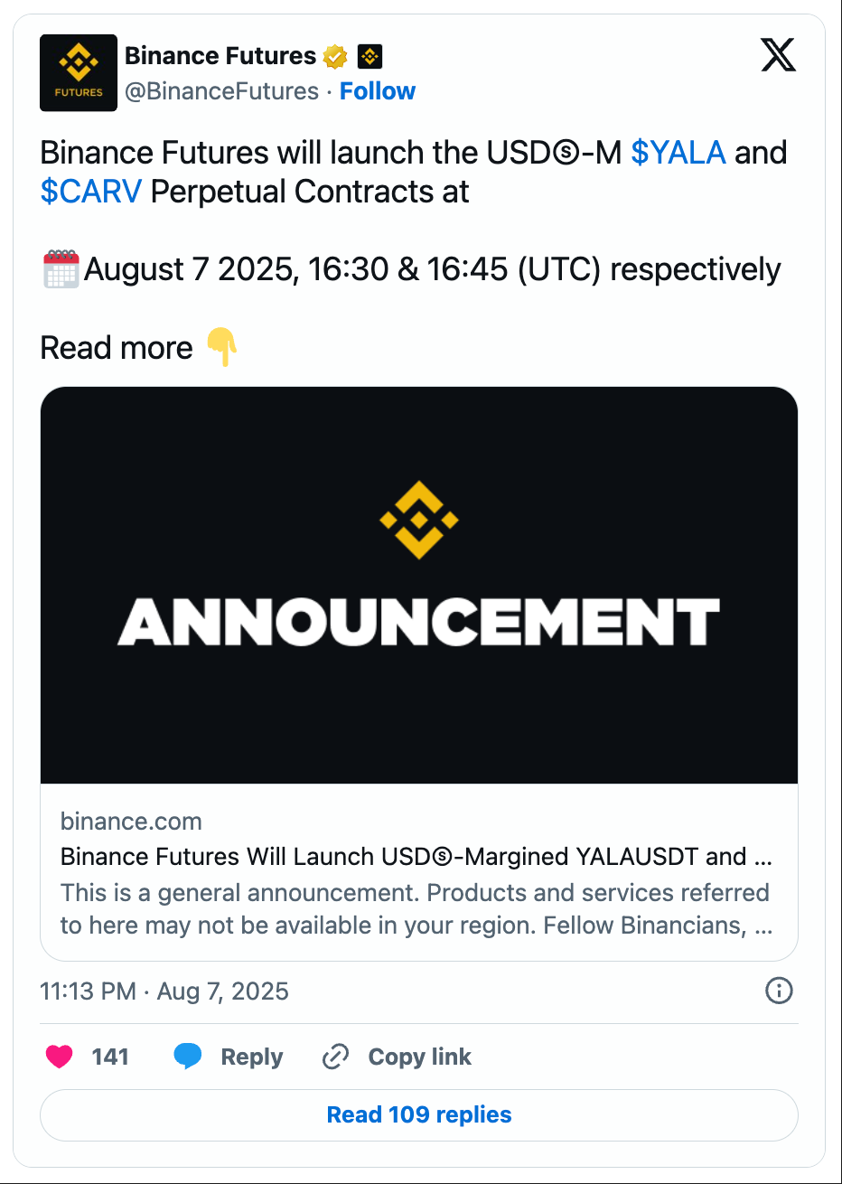 CARV is now listed on Kraken (post-only trading model) and Binance Futures, where USDⓈ-margined CARV perpetual contracts went live with up to 50x leverage, alongside BTC-liquidity token YALA.