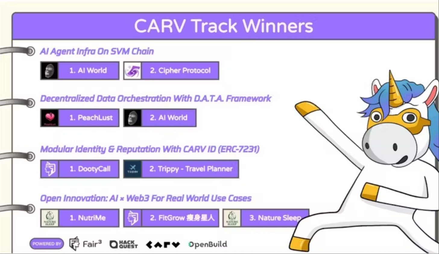 From AI-powered health copilots to generative storytelling and on-chain finance agents, winners showcased the full potential of CARV’s SVM Chain, D.A.T.A. Framework, and Agent IDs.