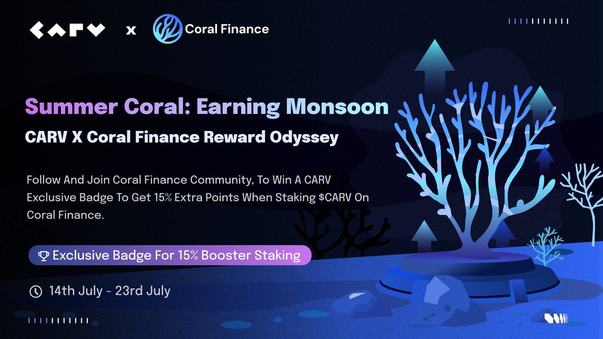 - Coral × CARV: Verifiable identity + DeFAI trading. Complete quests to earn 15% reward boosts.