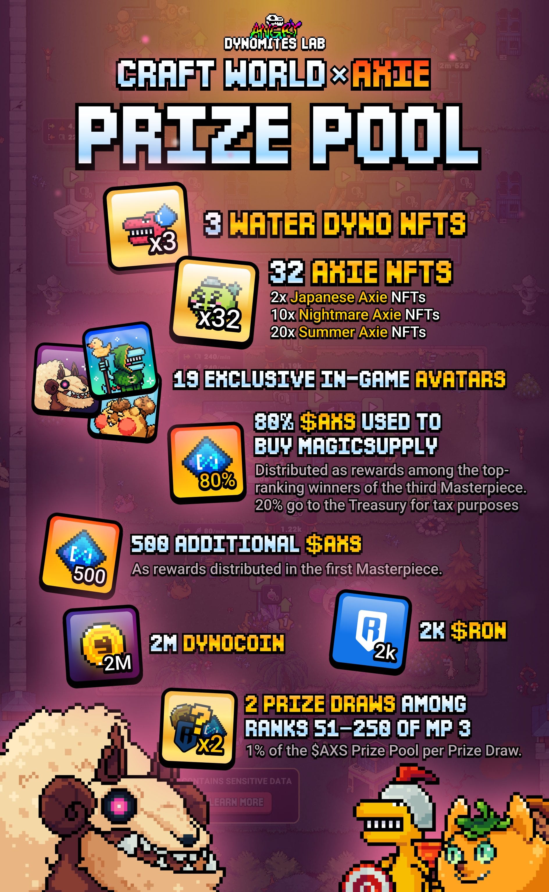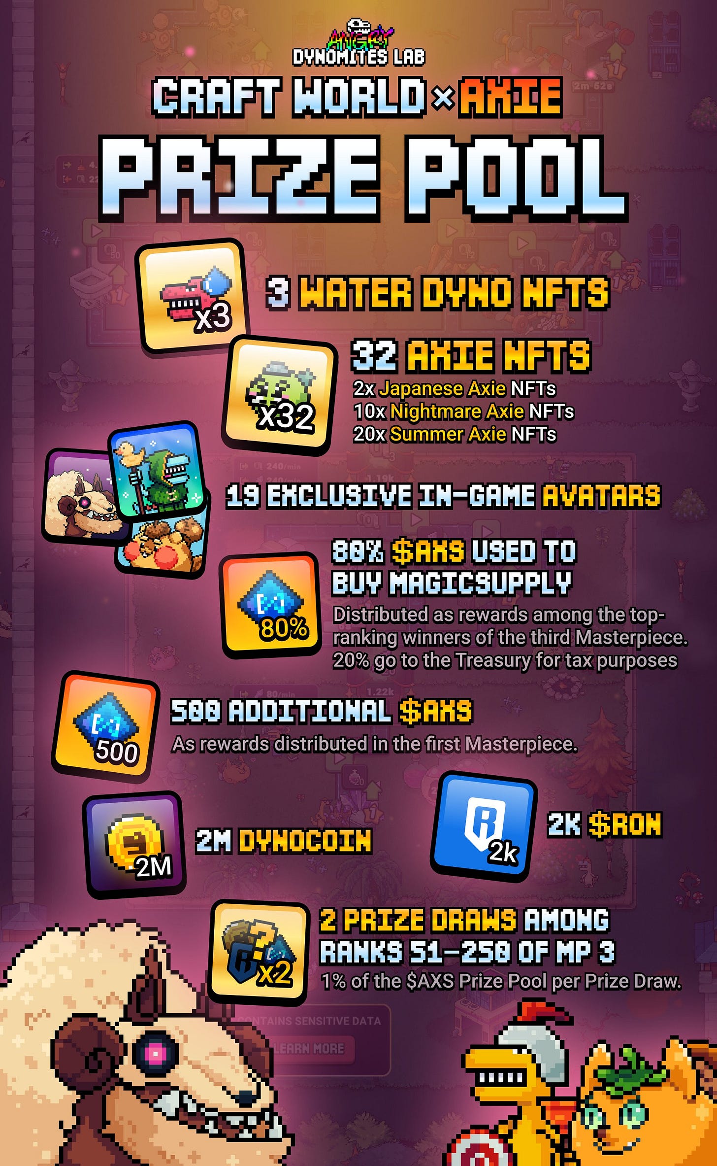 Craft World, in collaboration with Axie Infinity, will host the Masterpiece Event on October 15, 2025, at 9:00 PM, featuring a prize pool of NFTs, AXS, Dyno Coins, and RON. Players and creators can participate by crafting unique in-game artworks and competing for collectible rewards. The event bridges two creative Web3 ecosystems—Craft World’s building gameplay and Axie Infinity’s player-driven economy—to celebrate art and community collaboration.