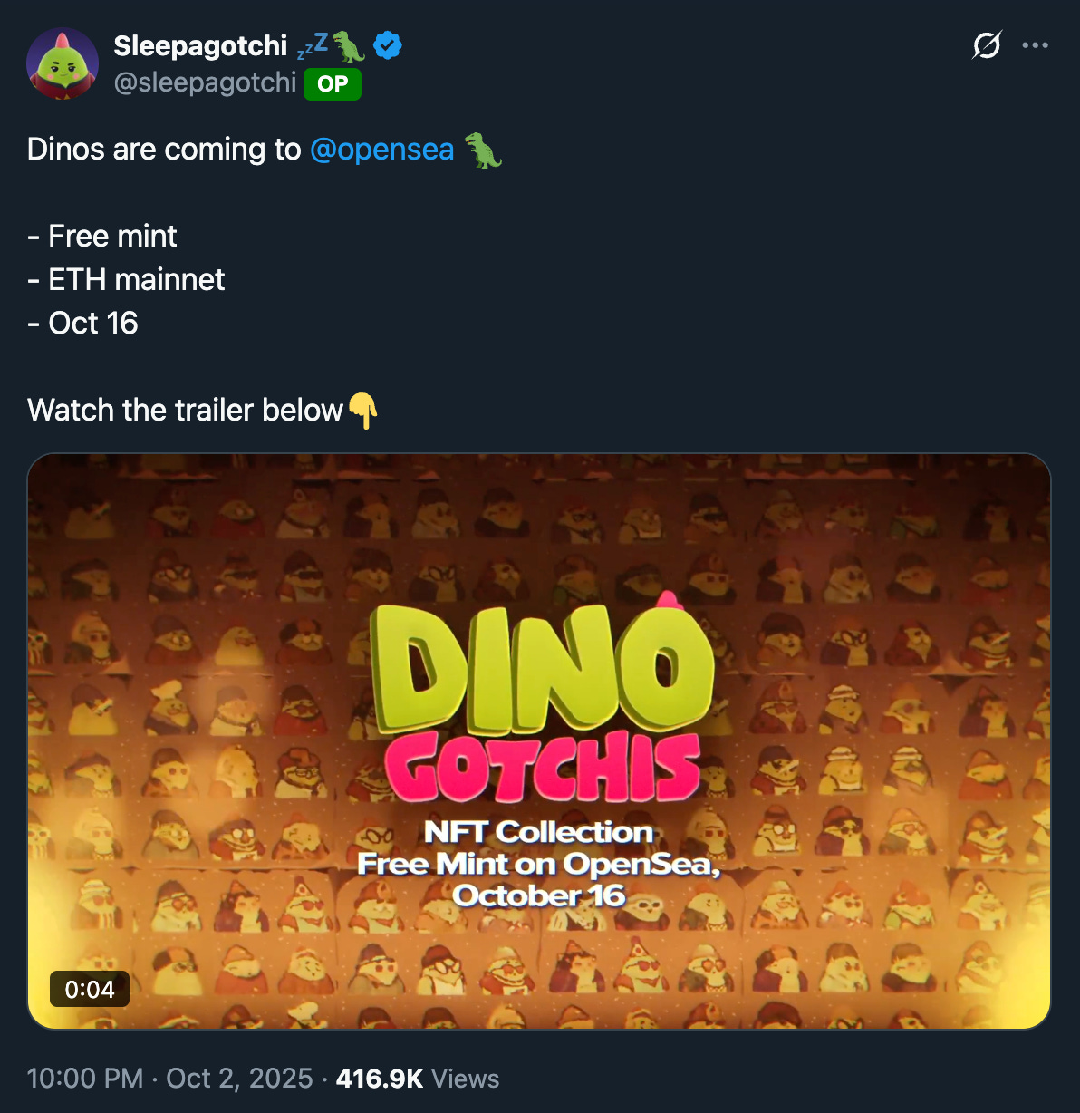 Sleepagotchi, the sleep-to-earn wellness app that gamifies rest and routine, will launch its Dino NFT Mint on October 16, 2025. The mint is free with supply yet to be announced, offering users the chance to collect limited-edition Dino companions tied to upcoming in-app bonuses and seasonal events.