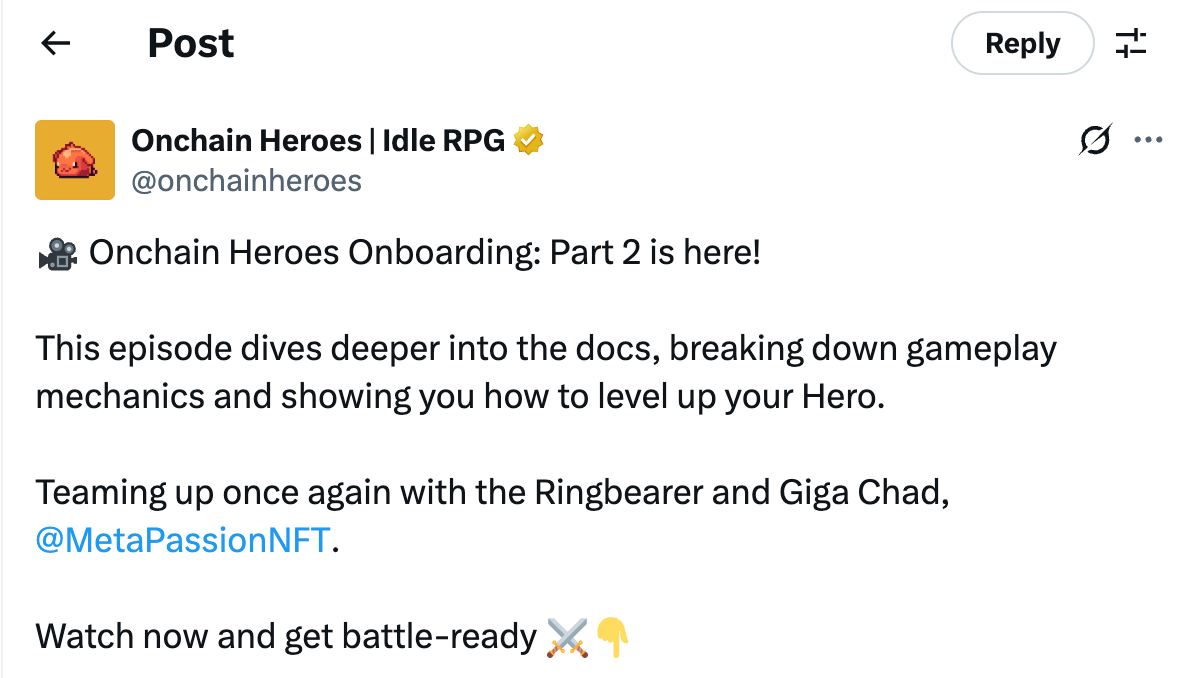 Onchain Heroes has released the second episode of its onboarding series, offering a detailed walkthrough of gameplay mechanics and Hero progression. The video features returning collaborators Ringbearer and Giga Chad, alongside MetaPassionNFT. Designed to help players better understand the in-game systems, the episode aims to prepare users for upcoming battles.