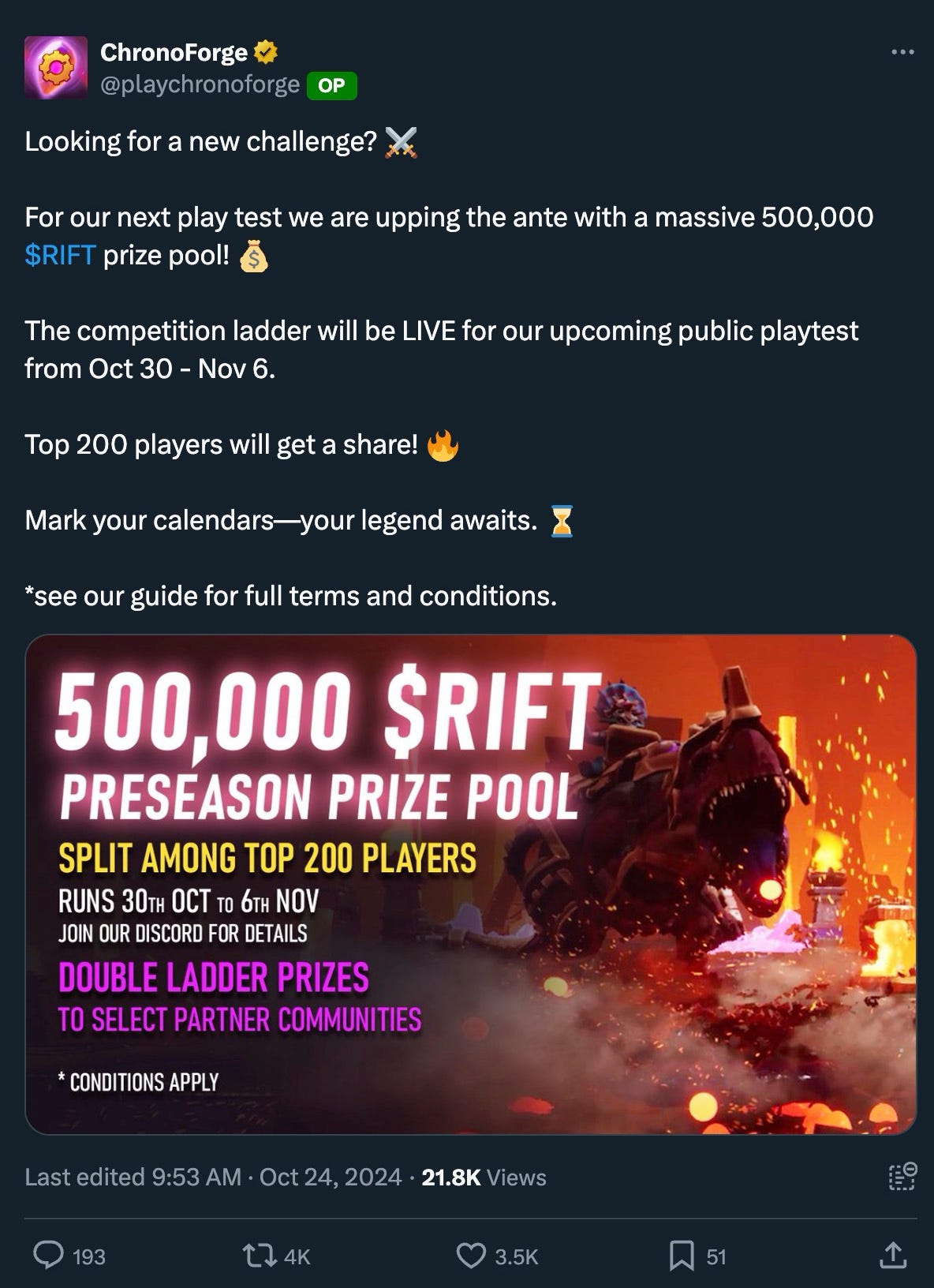 ChronoForge Playtest & Competition: Oct. 30 - Nov. 6, with a 500K $RIFT prize pool. Read More
