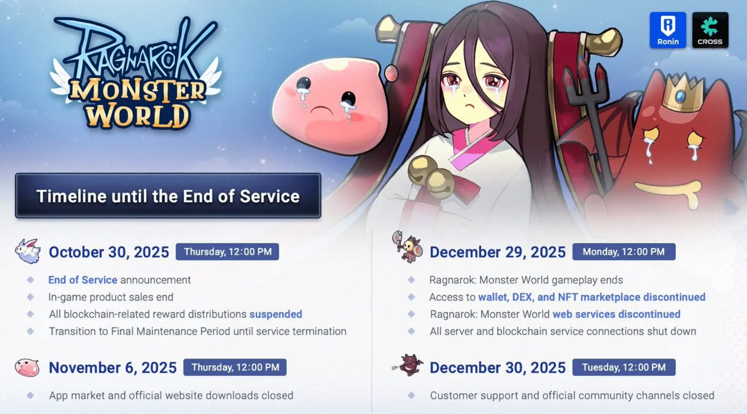 Web3 strategy game Ragnarok: Monster World will shut down on December 29, 2025, citing financial difficulties and fallout with the Ronin Network. Developed by ZERO X AND under Gravity’s license, the game will disable all blockchain features, NFTs, and token functions as part of its phased closure. The title had migrated from Ronin to CROSS Protocol earlier this year after partnership disputes. All gameplay and support services will cease by December 30, marking the end of the project’s 14-month run.