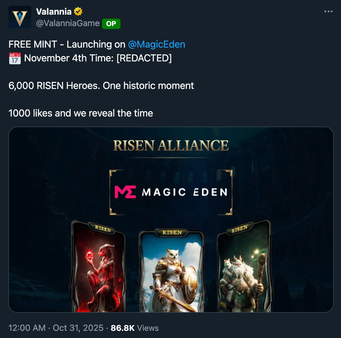 Valannia, the upcoming fantasy RPG featuring NFT-based heroes and strategy-driven combat, will launch its Risen Heroes NFT Mint on November 4, 2025. The mint is free, with a total supply of 6,000 NFTs, allowing players to claim unique hero characters that can later be used in-game.