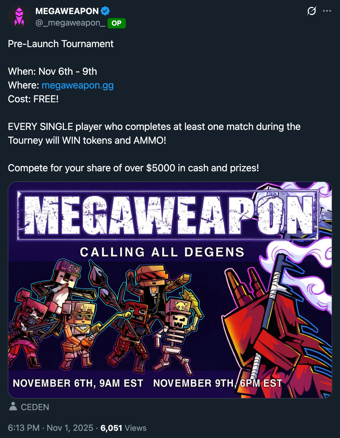 MegaWeapon Pre-Launch Tournament Runs Nov 6–10 with $5K+ Prize Pool Read More