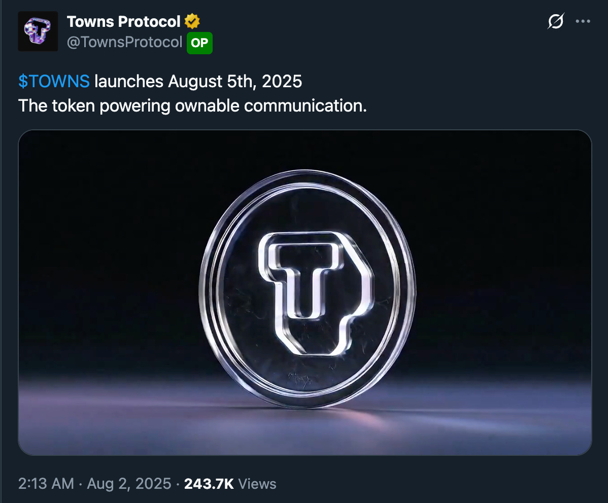 Towns Protocol $TOWNS TGE & Listing Set for August 5 Read More