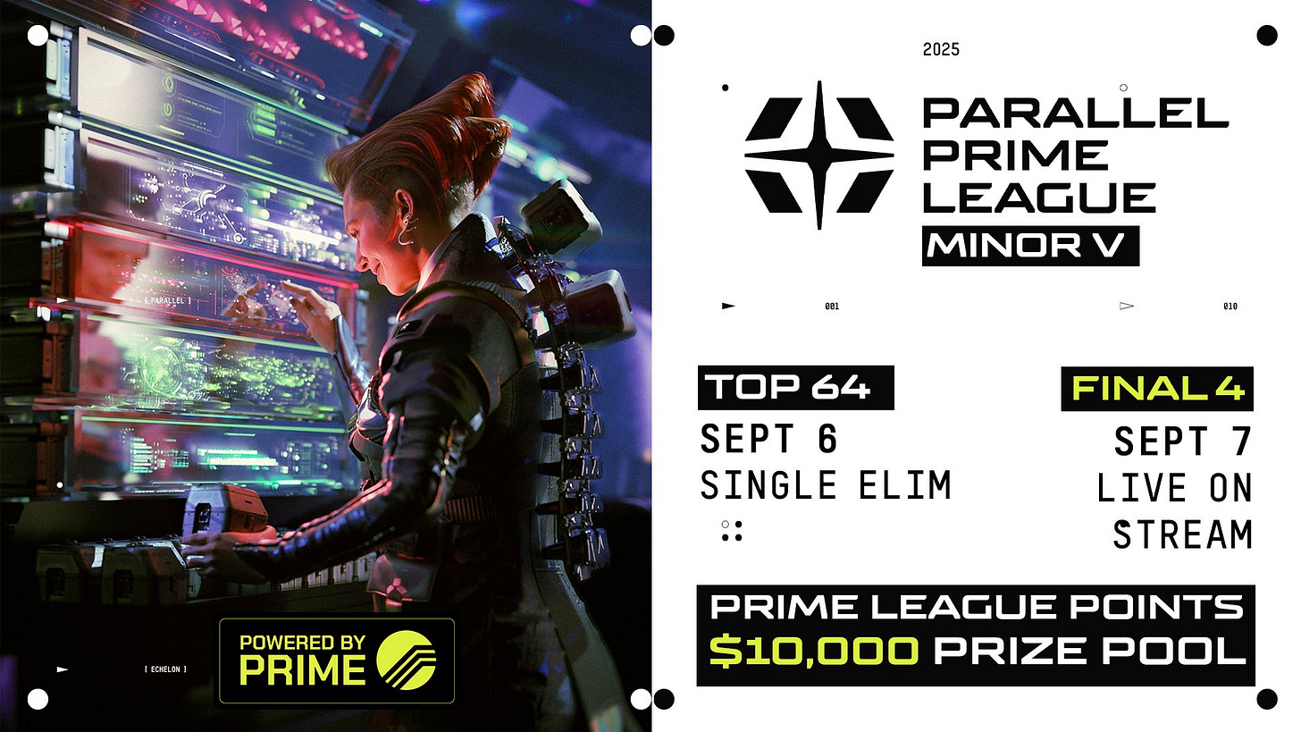 Parallel TCG, the sci-fi trading card game on Ethereum, will host Prime League Minor V from September 6 to 7, 2025, featuring a $10,000 prize pool. Players will battle through Swiss rounds, with top performers advancing to elimination brackets for cash prizes and league points.