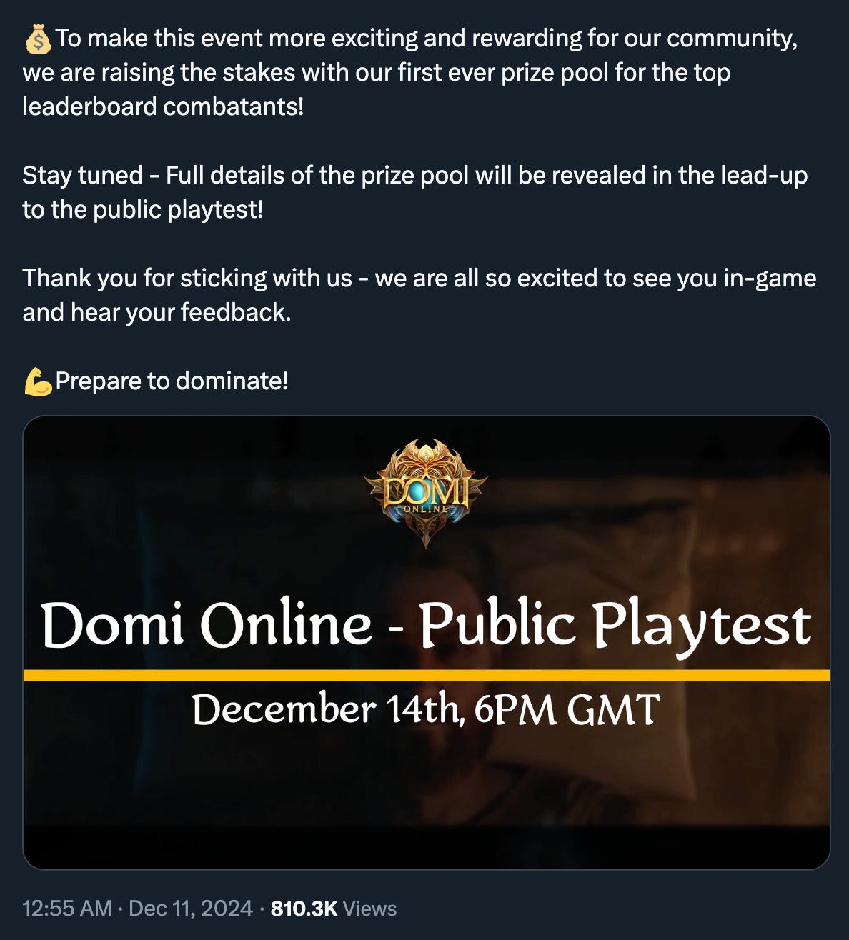 Domi Online Public Playtest with $10K price pool from Dec. 15 to Dec. 22 Read More
