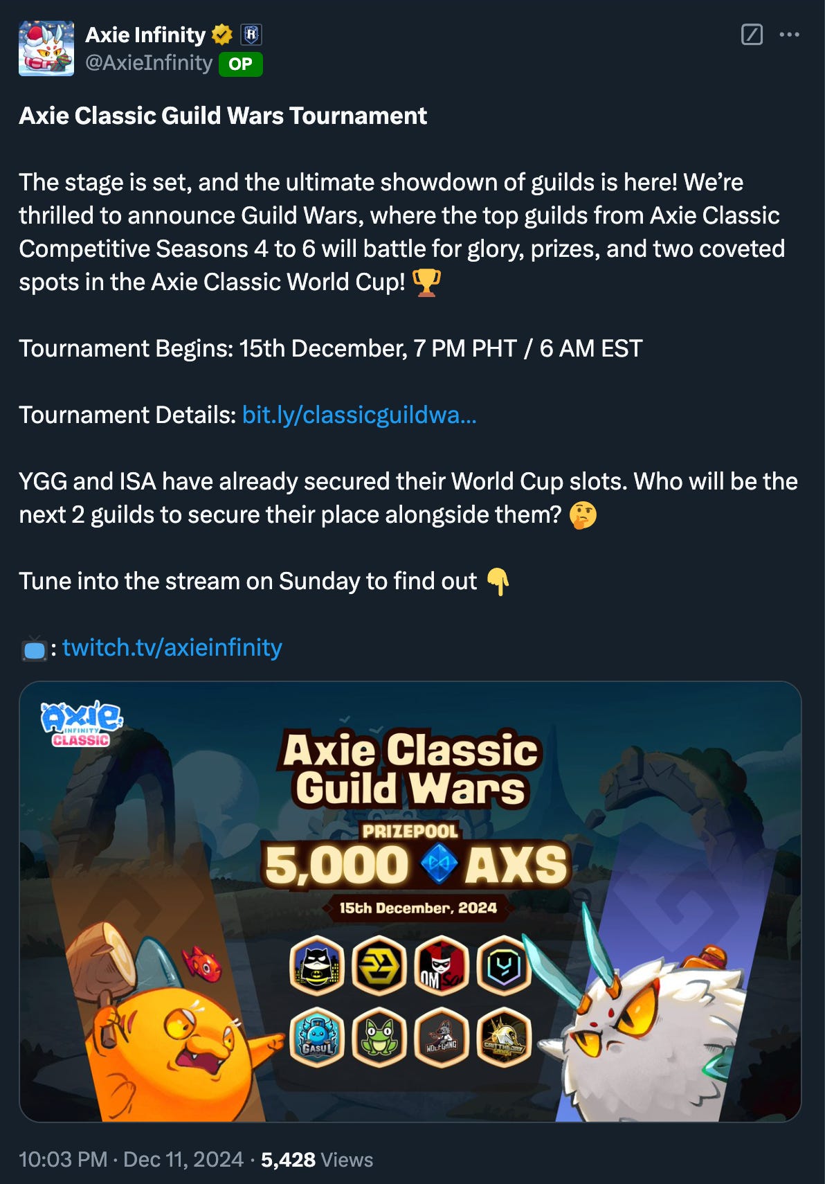 Axie Classic Guild Wars Tournament provides 500 AXS on Dec 15 Read More