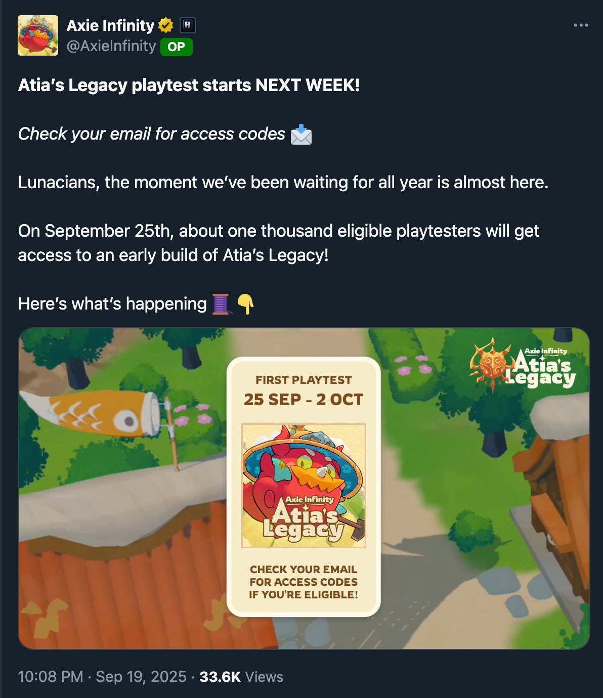 Atia’s Legacy, the upcoming game from the Axie Infinity universe, will host a Closed Playtest from September 25 to October 2, 2025. Selected players will get early access to test gameplay, mechanics, and progression systems while providing feedback to shape development.